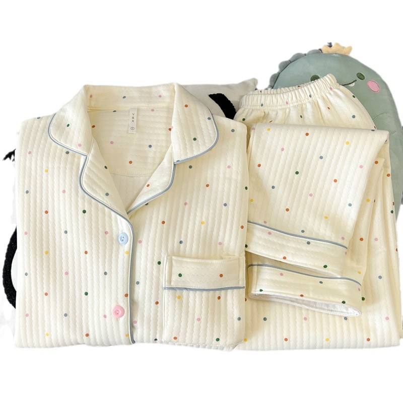 ชุดนอนผ้าถักลายจุดสำหรับผู้หญิง ฤดูใบไม้ร่วง ฤดูหนาว ผ้าหนานุ่ม อุ่นสบาย เอวยางยืด