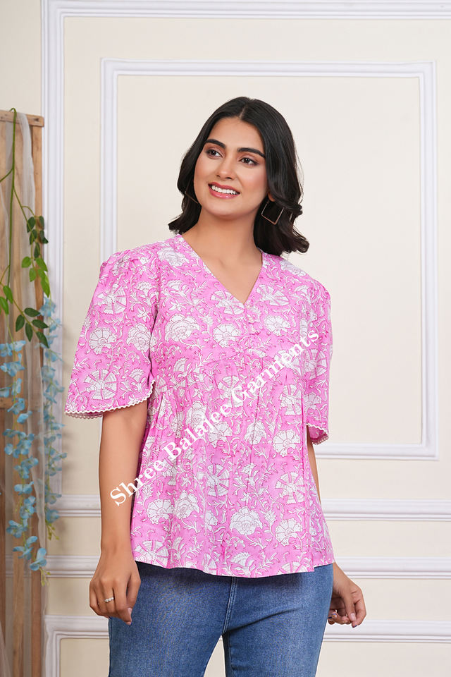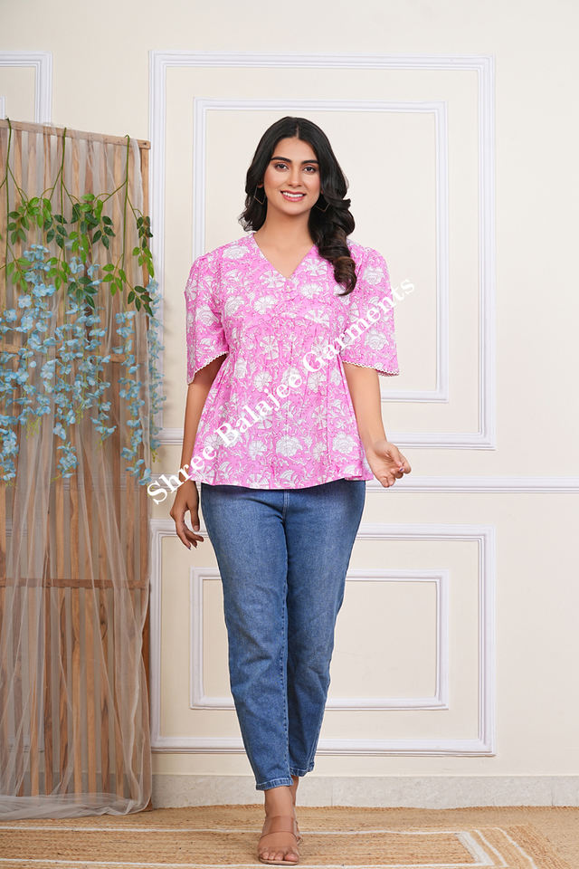 เสื้อครอปสตรีสีชมพูอ่อนลายดอกไม้พิมพ์มือแบบดั้งเดิม ผ้าฝ้าย 100% สไตล์ชาติพันธุ์ เหมาะสำหรับใส่ลำลองหรืองานปาร์ตี้ ซักได้