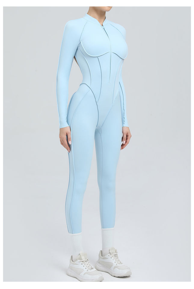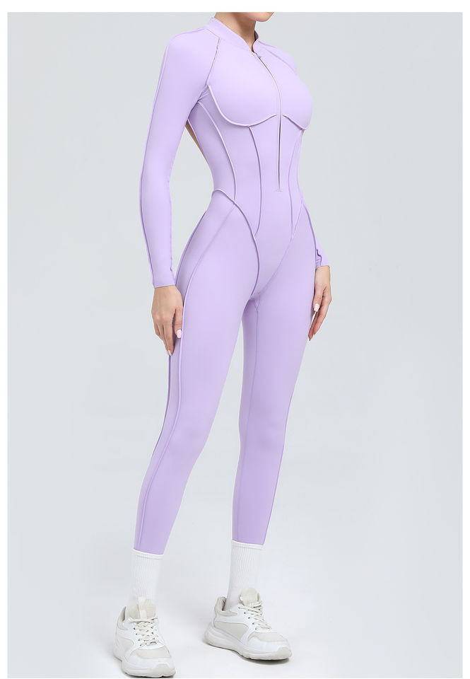 ชุดจั๊มสูทโยคะแบบเปิดหลังสำหรับผู้หญิง แขนยาว ซิปครึ่งตัว ชุดบอดี้สูทฟิตเนส กระชับรูปร่าง ชุดออกกำลังกายสำหรับใส่เล่นกีฬา ชุดรอมเปอร์สำหรับออกกำลังกายในยิม