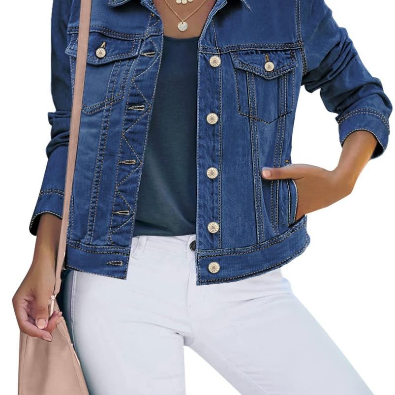 แจ็กเก็ตผ้ายีนส์แขนยาวเข้ารูปผ้ายีนส์แบบเรียบง่ายสำหรับฤดูหนาวผ้าบอมเบอร์ผ้าฝ้ายพิมพ์ลาย
