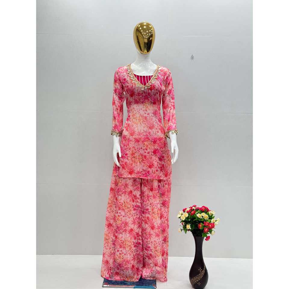 ชุดเสื้อและพลาซโซชุดปาร์ตี้พิมพ์ลายดิจิตอลที่สวยงามของผู้หญิง
