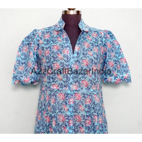 เดรสผู้หญิงลายดอกไม้พิมพ์ลายบล็อกด้วยมือ ดีไซน์ใหม่สวยงาม ผ้าฝ้าย 100% ความยาวปานกลาง คอวี แขนสั้น มีกระเป๋า ตกแต่งด้วยกระดุม