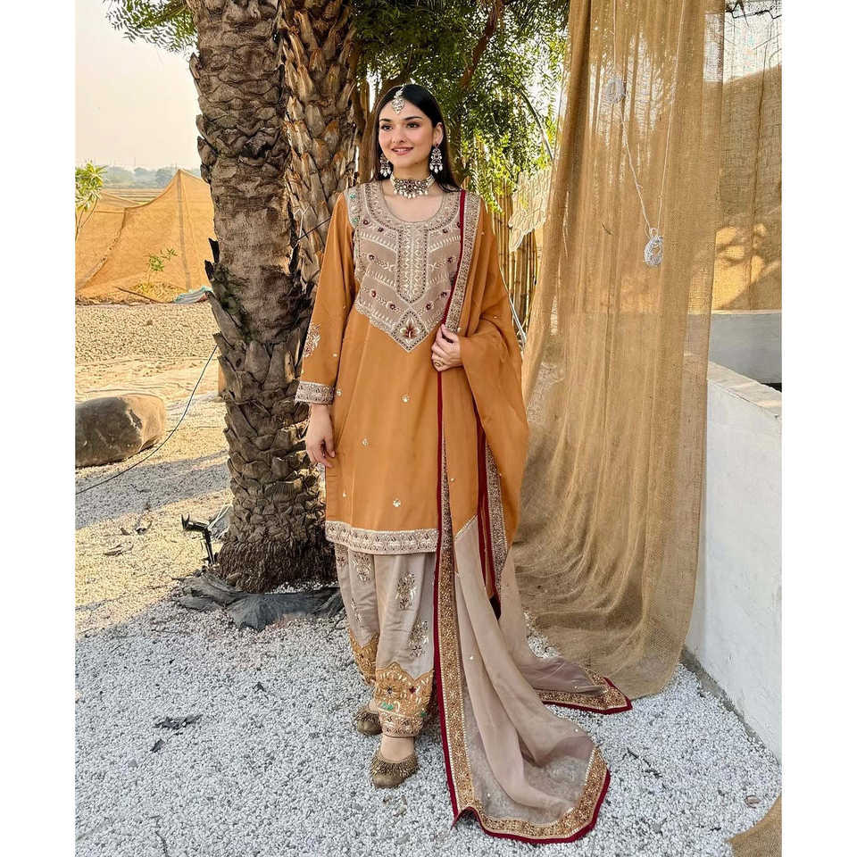 ด้านบนด้านล่างที่สวยงามของผู้หญิงและชุดเสื้อผ้าที่มีงานปักจำนวนมาก