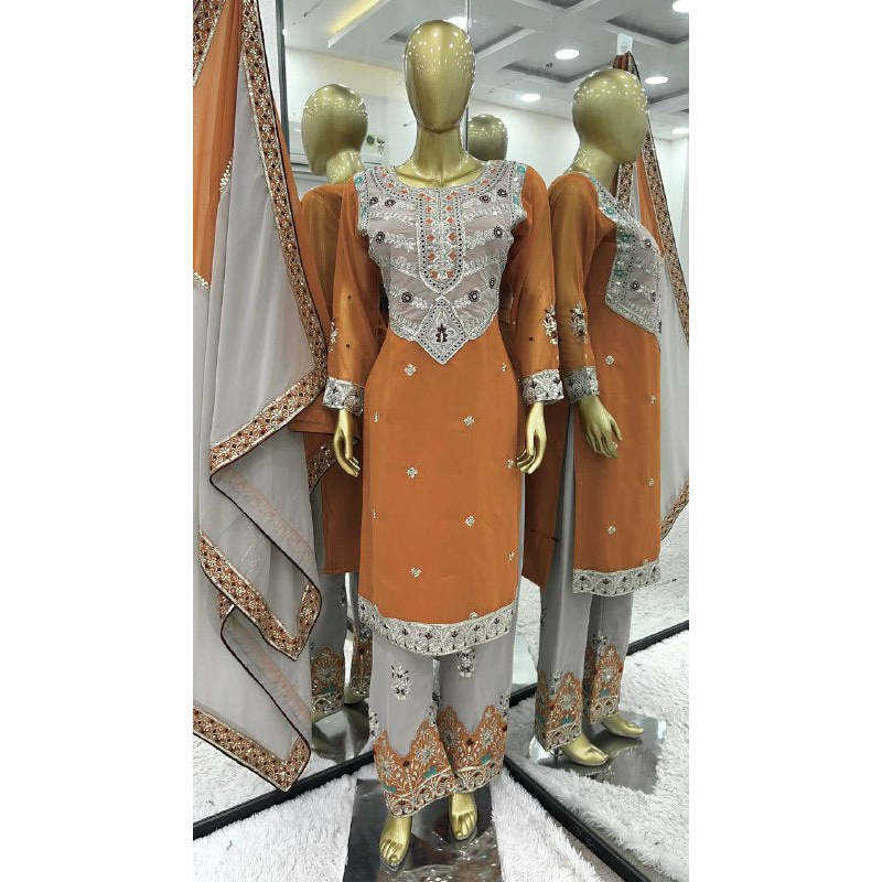 ด้านบนด้านล่างที่สวยงามของผู้หญิงและชุดเสื้อผ้าที่มีงานปักจำนวนมาก