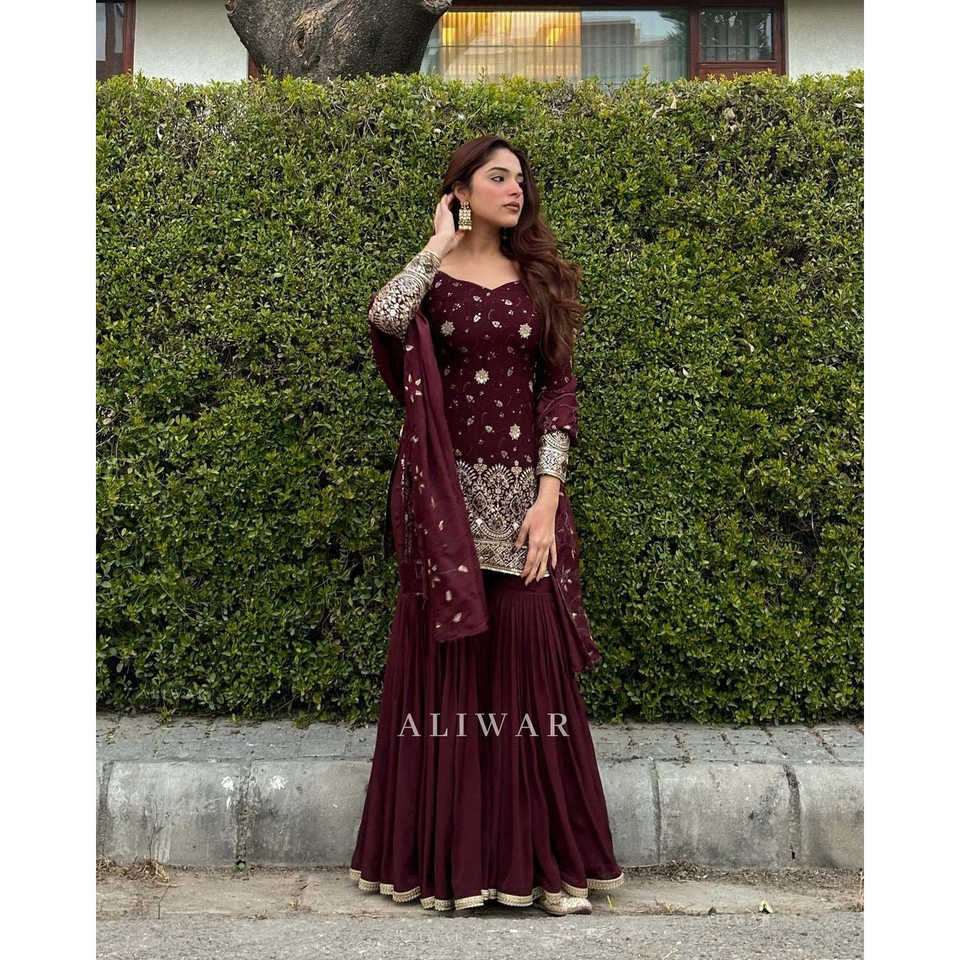 ชุดพลาซโซและชุดดูปองตาที่สวยงามของผู้หญิงมีงานปักจำนวนมาก
