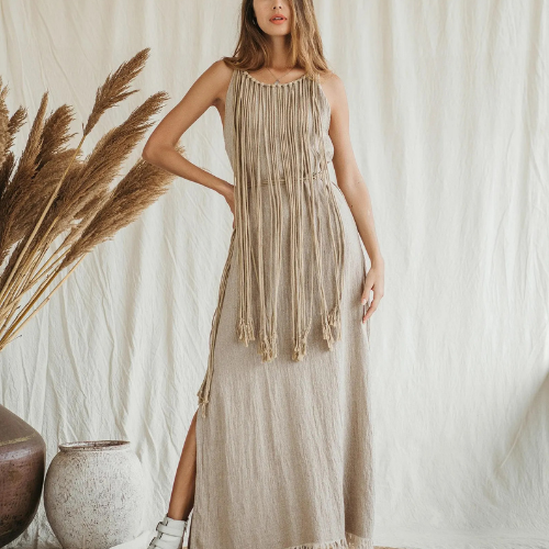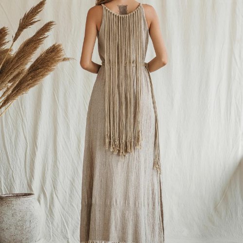 เดรสยาวสไตล์โบฮีเมียนสีเบจสำหรับผู้หญิง ชุดเดรสสำหรับเทศกาลฤดูร้อน ผ้าฝ้ายดิบแต่งชายครุยและงานถักมาคราเม่แบบตะวันตก