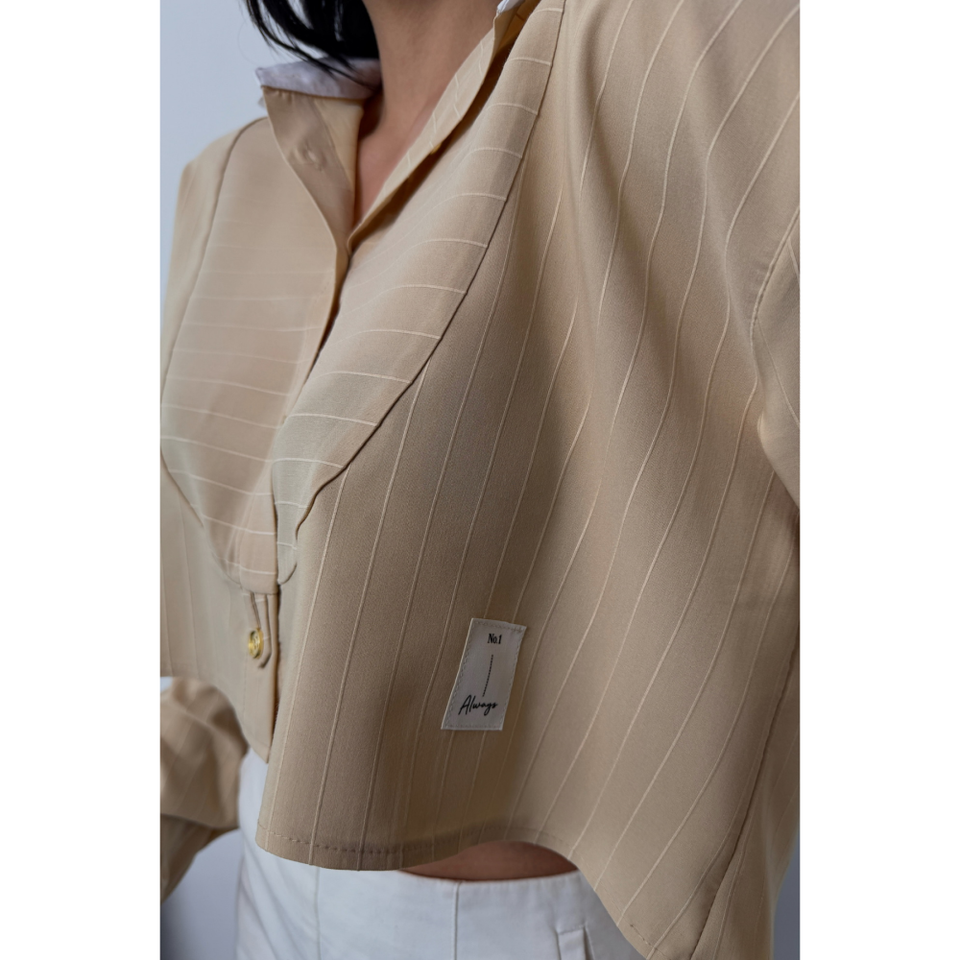 เสื้อครอปสีเบจสำหรับผู้หญิง คอปกสีขาว พร้อมรายละเอียดป้าย