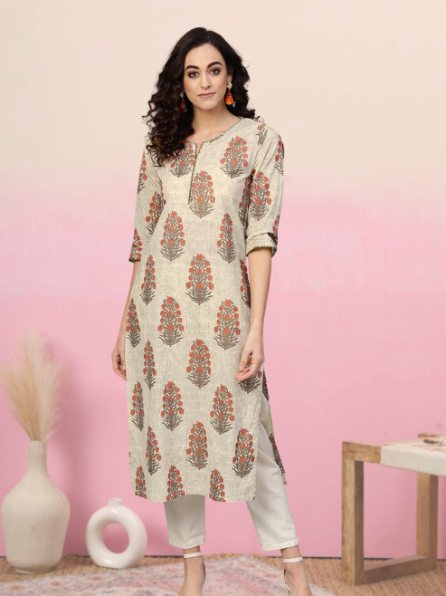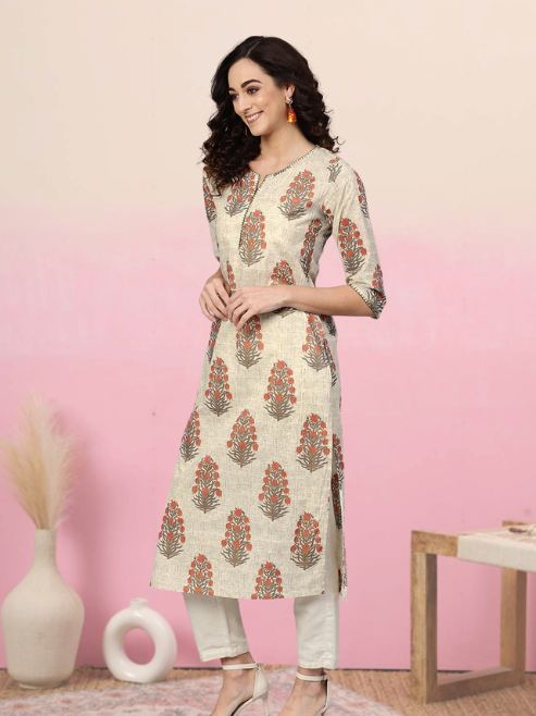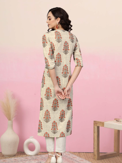 Women's Beige Cambric Cotton Sequin Work Straight Kurta Neck Three Fourth Sleeves Summer Ethnic Casual Wear Quick Dry Recycled