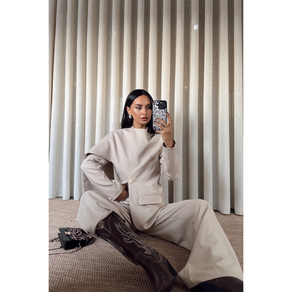ชุดสูทผู้หญิงสีเบจ รุ่นมาซิม แจ็คเก็ตปกชาลและกางเกงขายาว ดีไซน์หรูหรา