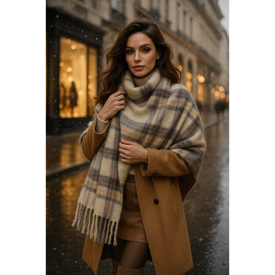 ผ้าพันคอ/ผ้าคลุมไหล่ลายสก็อตสีเบจสำหรับผู้หญิง รุ่น SAL1297 ลายพิมพ์สไตล์ชาติพันธุ์ บริการสกรีนโลโก้ตามสั่ง