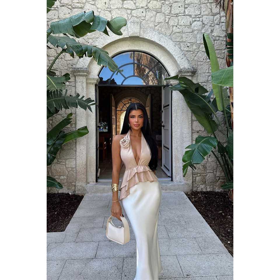 เสื้อครอปผูกเชือกสีเบจลายดอกกุหลาบสำหรับผู้หญิง