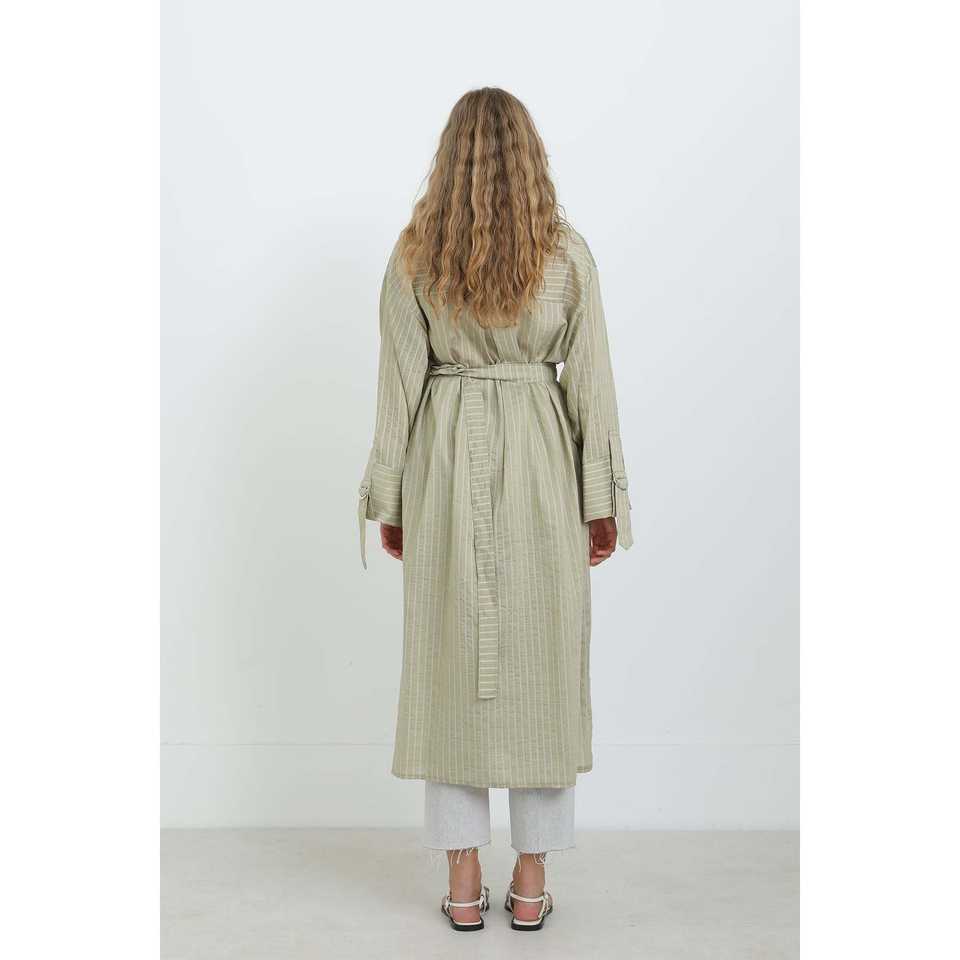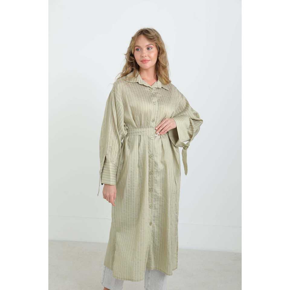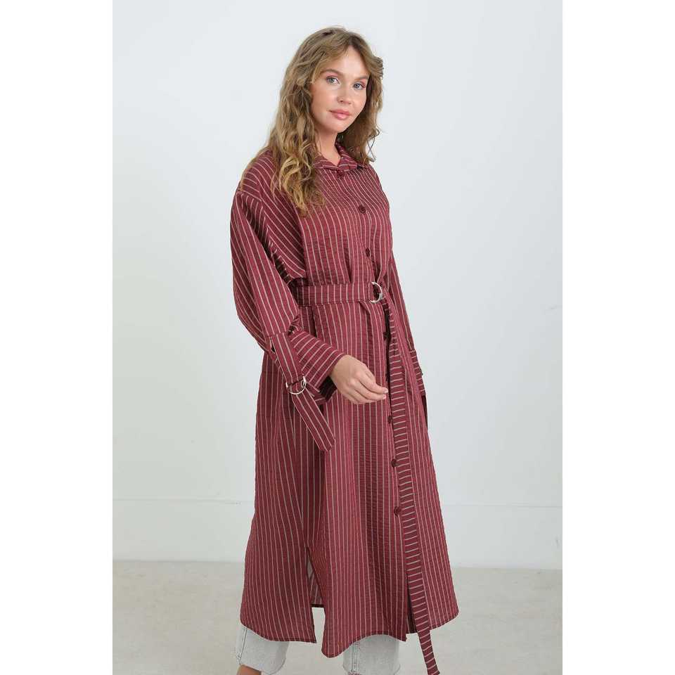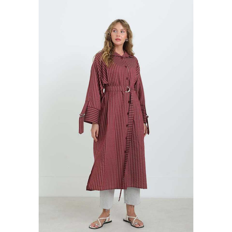 เสื้อเชิ้ตทูนิคผู้หญิงลายทางมีเข็มขัด ผ้าป๊อปลิน ติดกระดุม สวมใส่สบายๆ ทุกวัน