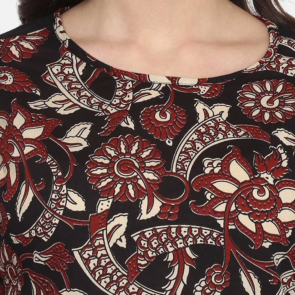 Women's Black Cotton Slub Kalamkari Printed A-Line Kurta Neck Three-Fourth Sleeves Summer Ethnic Casual Wear Quick Dry Recycled