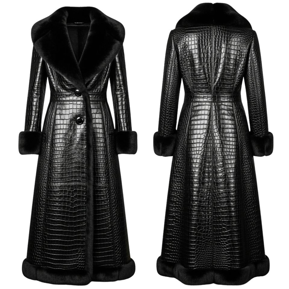 Women's Black Crocodile Pattern Leather Long Coat With Fur Collar Winter Fashion Outerwear OEM & Custom Logo By Maximize Wear