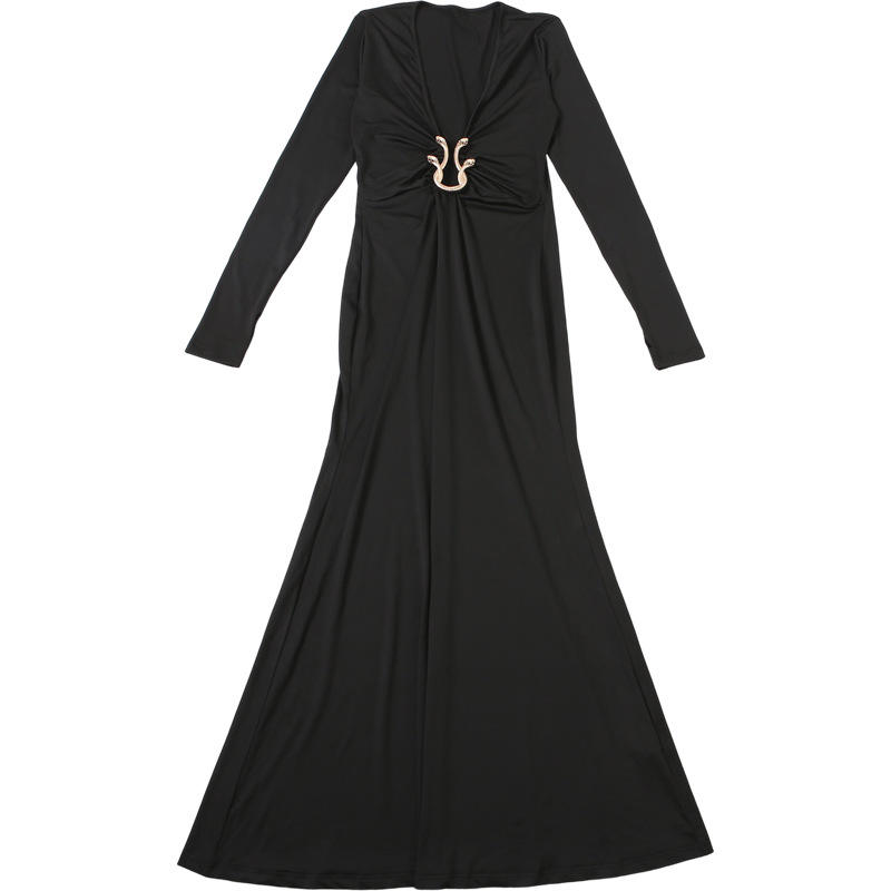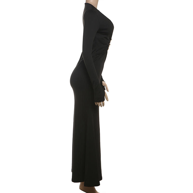 เดรสยาวสีดำคอวีลึกสำหรับผู้หญิง - เดรสยาวทรงเข้ารูปช่วงเอวพร้อมดีเทลฮาร์ดแวร์สีทอง แฟชั่น
