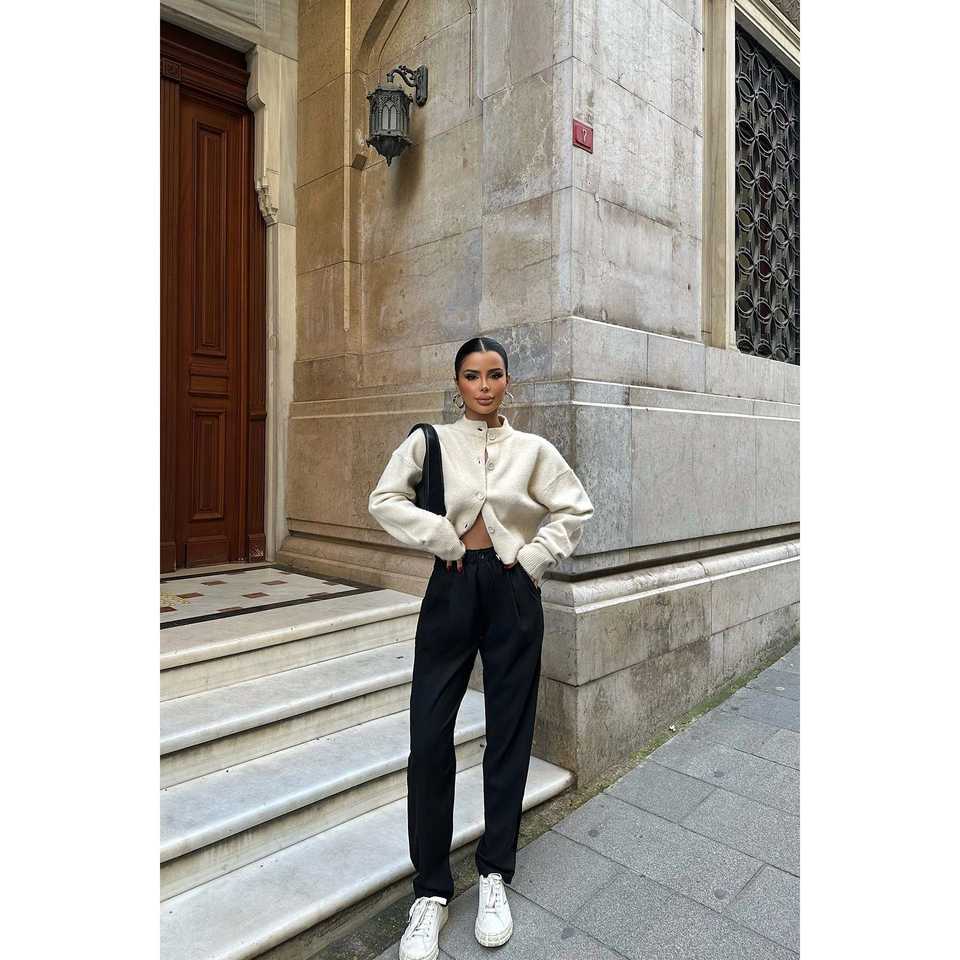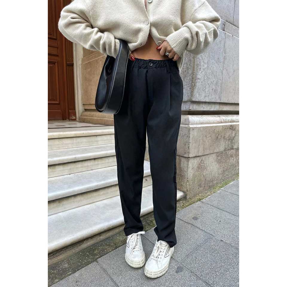 กางเกงขายาวทรงขาบานเอวยางยืดสีดำสำหรับผู้หญิง ผ้าคอร์ดูรอยระบายอากาศได้ดี กางเกงลำลองแฟชั่นทันสมัย ผ้าทอ