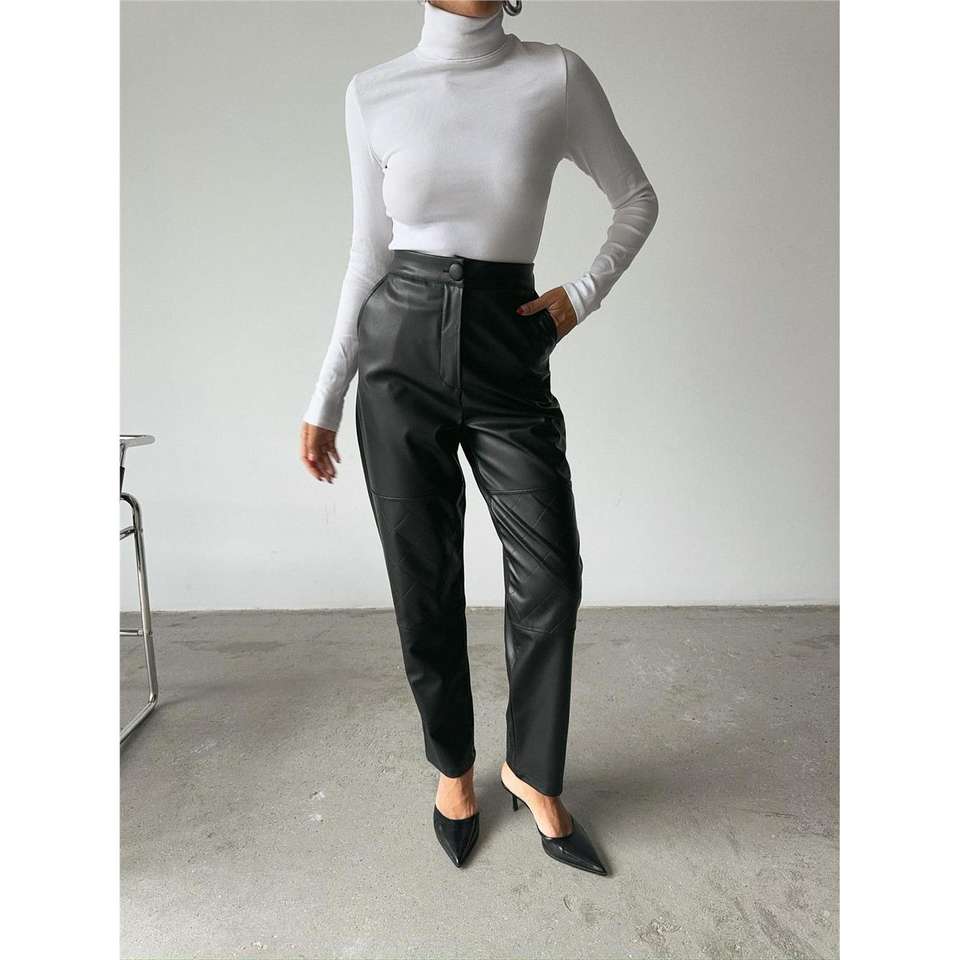 กางเกงหนังสีดำสำหรับผู้หญิง เอวยางยืด ระบายอากาศได้ดี เหมาะสำหรับใส่ทำงานหรือลำลอง ไซส์ XL สีล้างสีพื้น เอวยางยืด