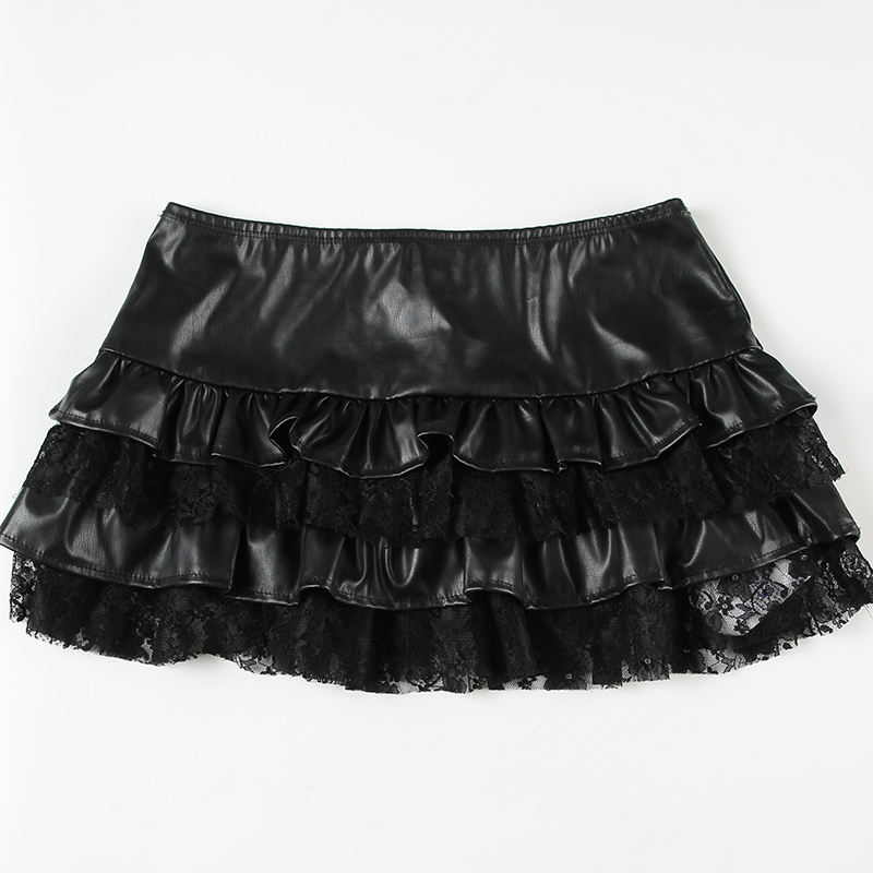 Women‘s Black PU Leather Mini Skirt Lace Ruffle Layered Design High Waist Sexy Gothic Fashion Skirt for Party Wear