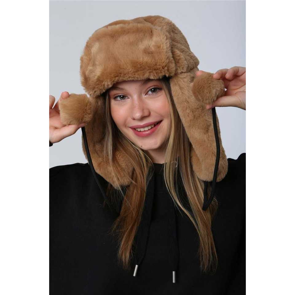 หมวกบีนนี่ขนปุยสีดำสำหรับผู้หญิง พร้อมพู่ห้อยและที่ปิดหูแบบขนฟู รุ่น 1103