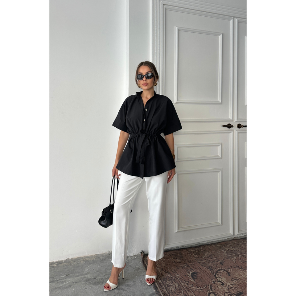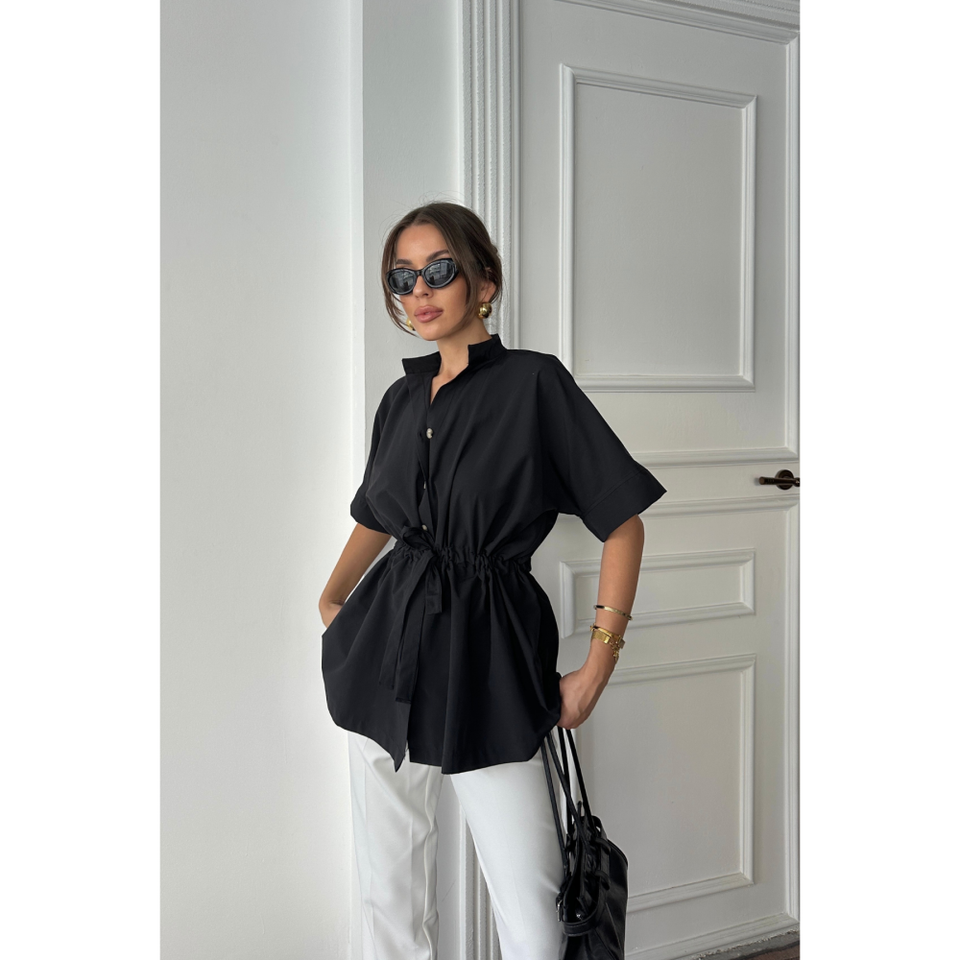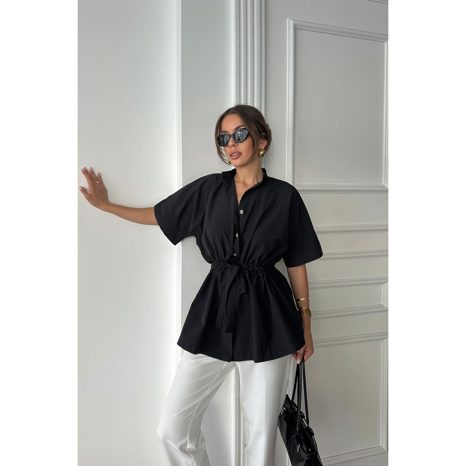 เสื้อเชิ้ตผ้าป๊อปลินสีดำสำหรับผู้หญิง พร้อมดีเทลจับจีบช่วงเอว เสื้อเบลาส์และเสื้อเชิ้ตสุดหรู