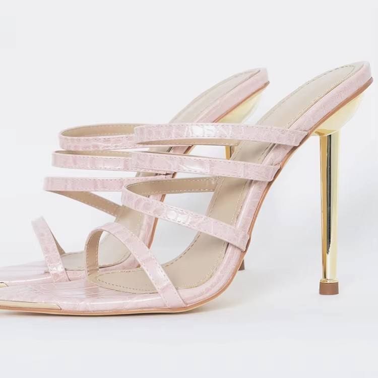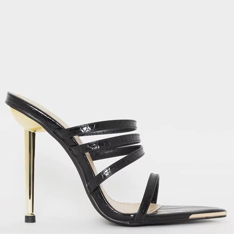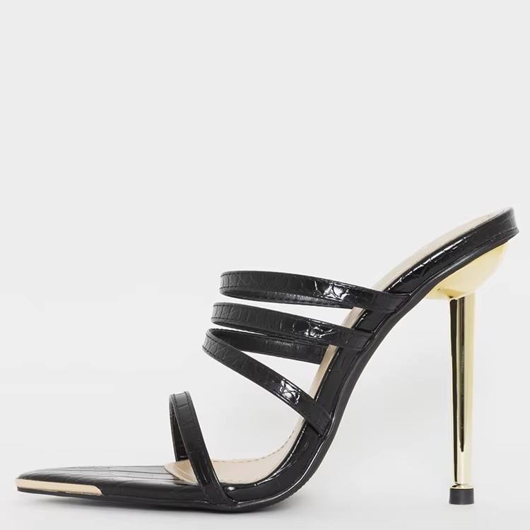 รองเท้าส้นสูงแบบสวมสำหรับผู้หญิง สีดำลายพิมพ์ สายรัดแบบมีสายรัด ส้นเข็มโลหะสีทอง รองเท้าแฟชั่นสำหรับงานปาร์ตี้