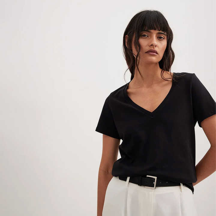 เสื้อยืดแขนสั้นคอวีสีดำสำหรับผู้หญิงเสื้อยืดธรรมดาใส่สบายๆใส่สบายๆใส่สบายๆใส่ได้100% โลโก้ได้ตามต้องการ