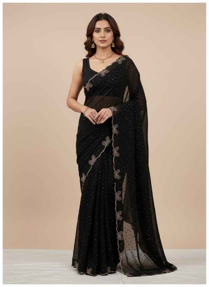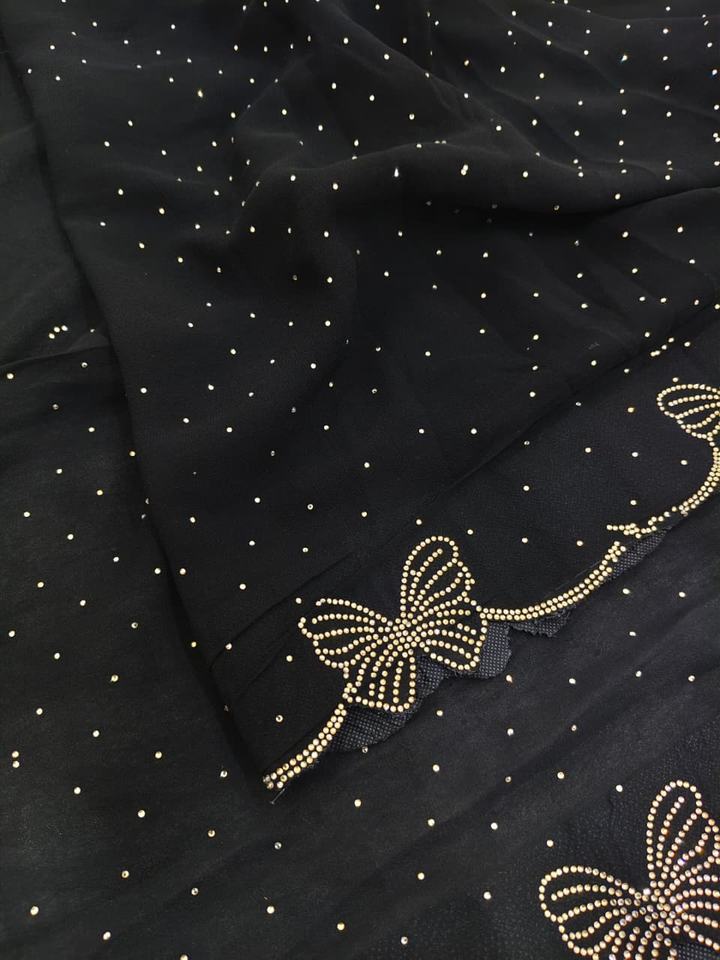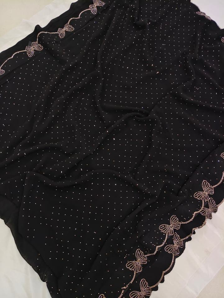 ชุดส่าหรีผ้าจอร์เจตต์สำหรับผู้หญิง ประดับด้วยผ้าไหมบังลอรีและงานปักคริสตัลสวารอฟสกี้ทั่วทั้งชุด พร้อมเสื้อ-สำหรับผู้ใหญ่ ผลิตในอินเดีย มีสินค้าพร้อมส่ง