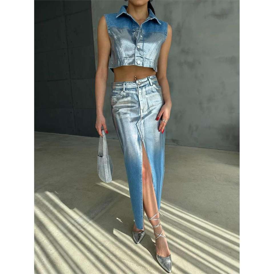 เสื้อกั๊กยีนส์สีน้ำเงินสำหรับผู้หญิง ตกแต่งด้วยลายฟอยล์