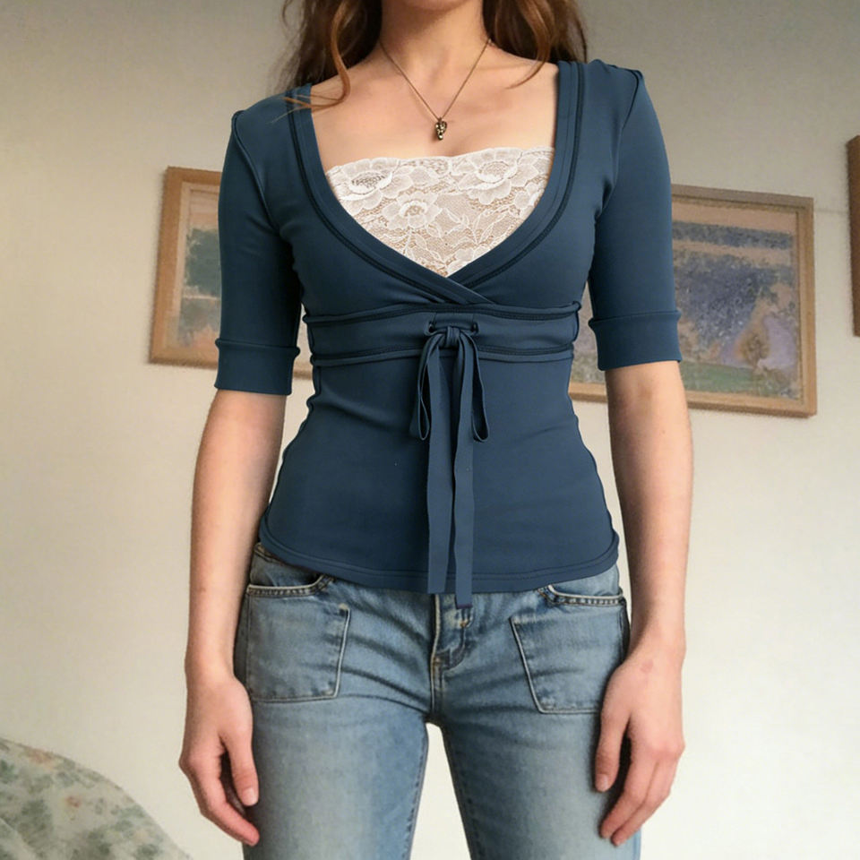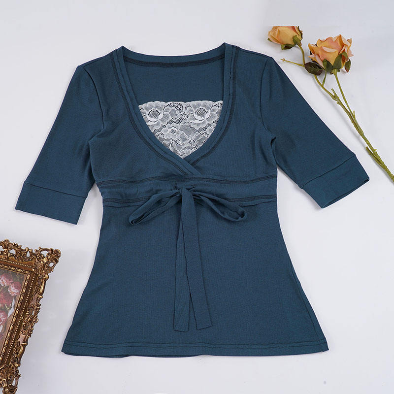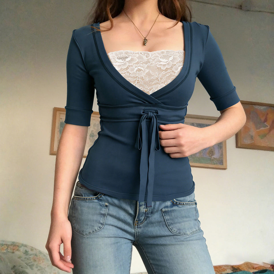 เสื้อผู้หญิงสีน้ำเงิน แขนยาวปานกลาง แต่งลูกไม้ คอวี มีเชือกผูกด้านหน้า ทรงเข้ารูป สไตล์วินเทจ เสื้อลำลอง
