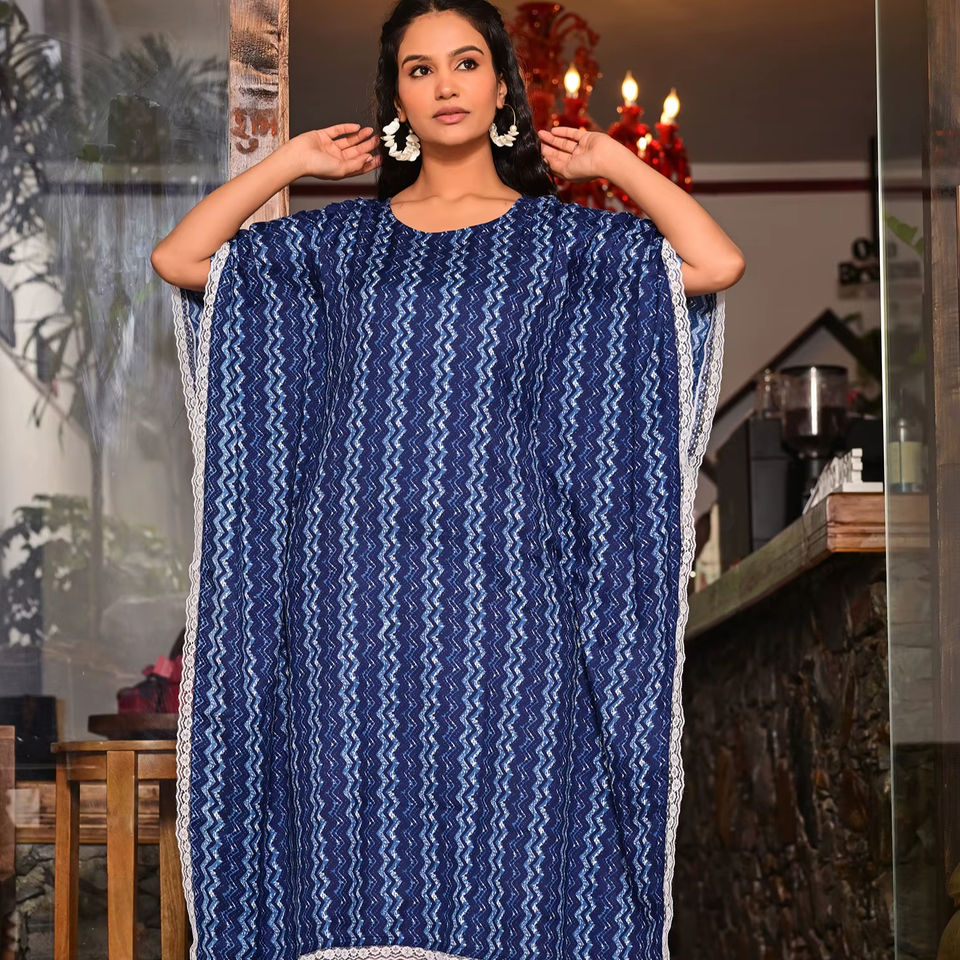 ชุดเดรสคาฟทันผ้าฝ้ายพิมพ์ลายสีน้ำเงินสำหรับผู้หญิง 100% ระบายอากาศได้ดี แขนทรงปีกค้างคาว เอวทรงธรรมชาติ พร้อมขอบลูกไม้
