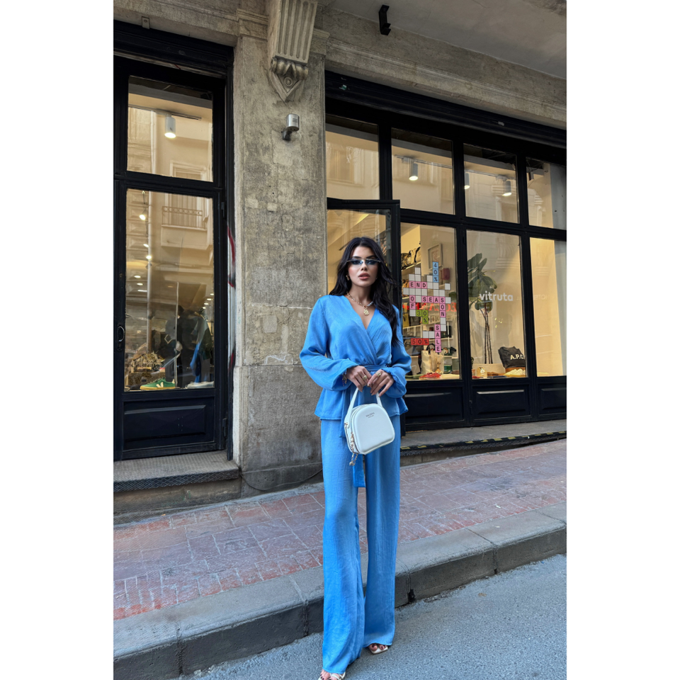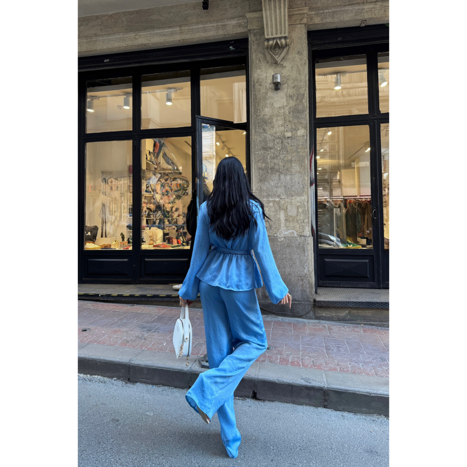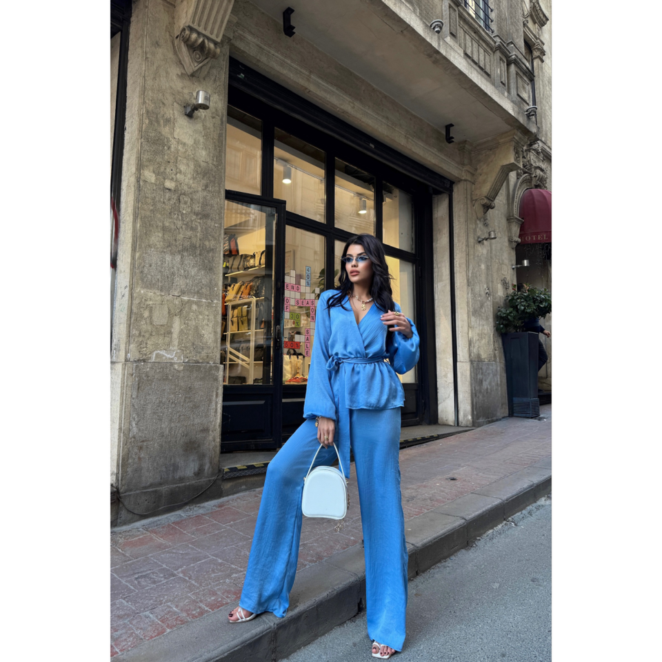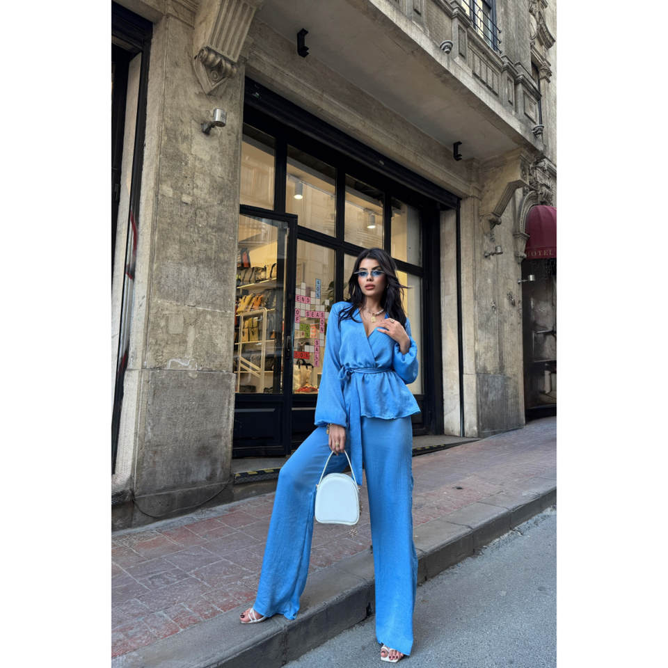 ชุดเสื้อและกางเกงผ้าซาตินสีน้ำเงินแบบผูกเอวสำหรับผู้หญิง