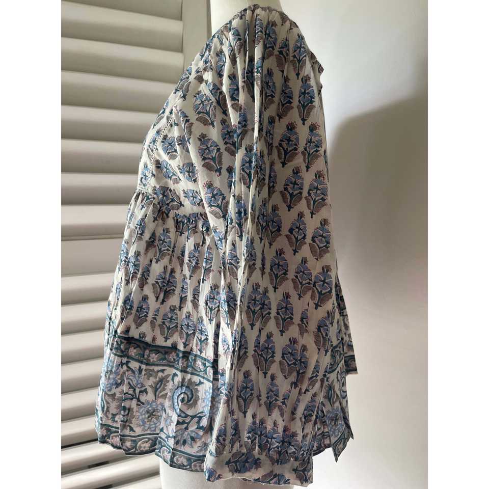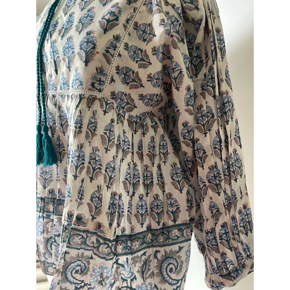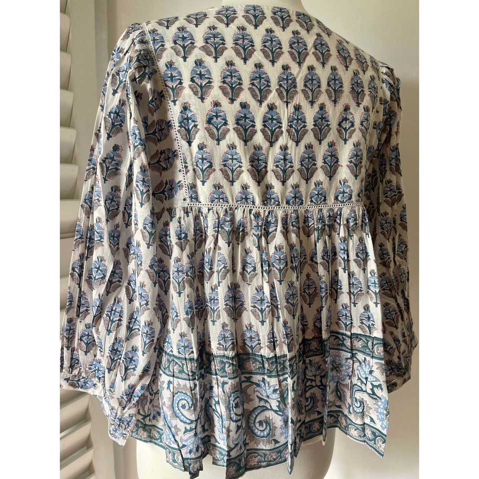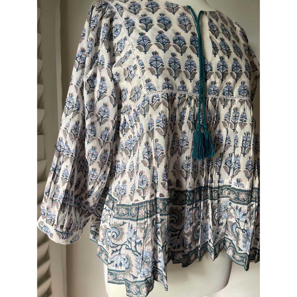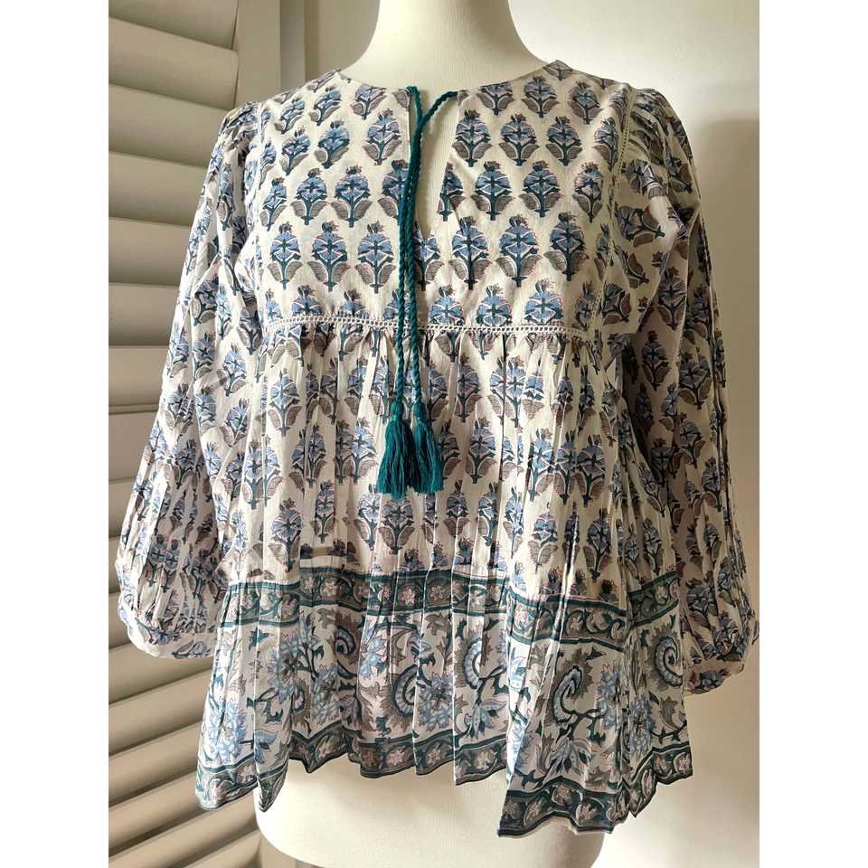 เสื้อโบฮีเมียนผู้หญิง คอระบาย ลายบล็อกพิมพ์ ทรงสี่เหลี่ยม สีเขียวอมฟ้า ผ้าป๊อปลินถัก ทรงหลวม ไซส์ XL สำหรับงานปาร์ตี้ ฤดูใบไม้ร่วง