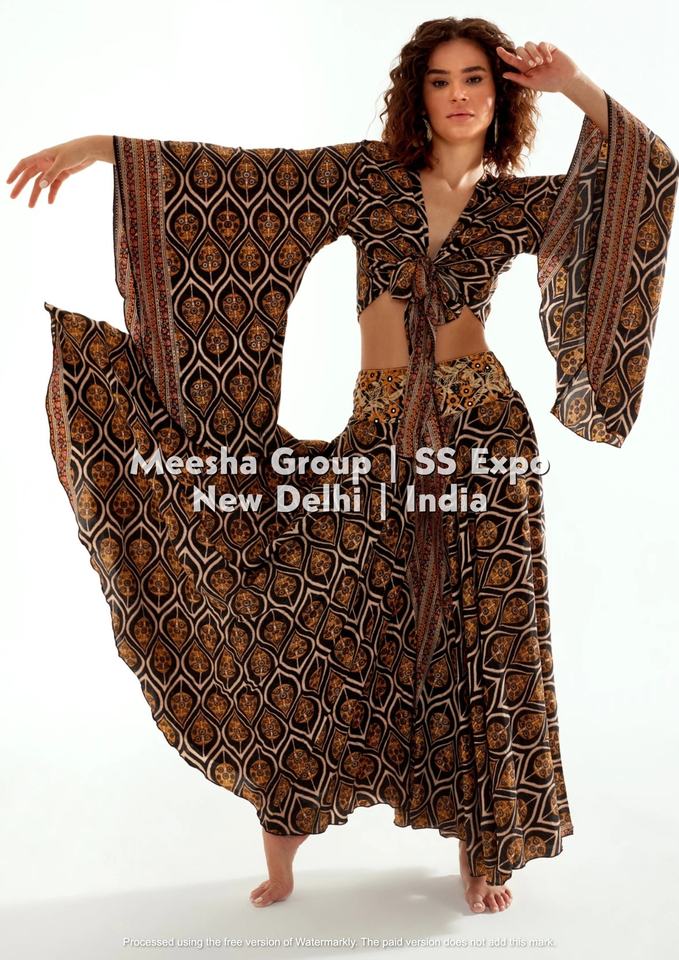 ชุดเซ็ตพิมพ์ลายโบโฮสไตล์ชาติพันธุ์สำหรับผู้หญิง – เสื้อครอปคอวีแขนยาวทรงกระดิ่งผูกเชือกพร้อมกระโปรงยาว – คละสี
