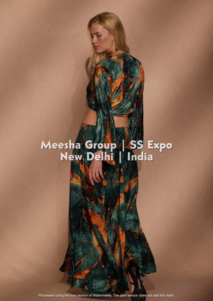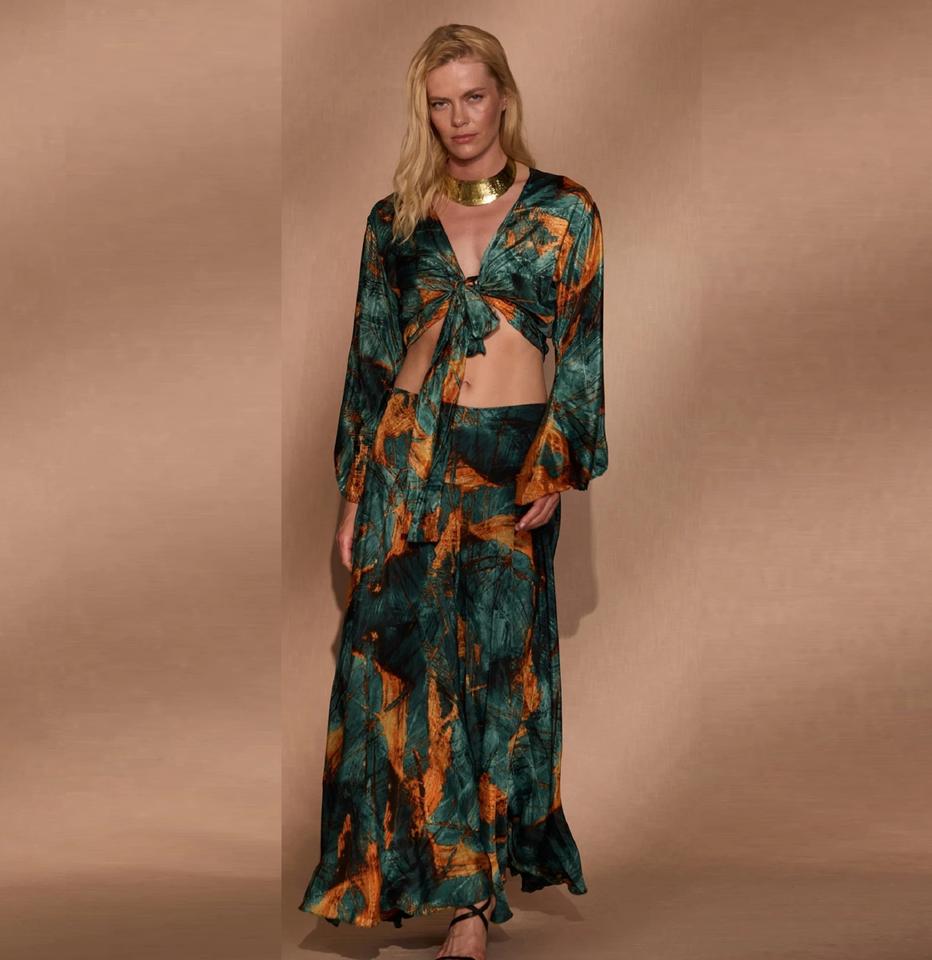 ชุดเซ็ตพิมพ์ลายโบโฮสไตล์ชาติพันธุ์สำหรับผู้หญิง – เสื้อครอปคอวีแขนยาวทรงกระดิ่งผูกเชือกพร้อมกระโปรงยาว – คละสี