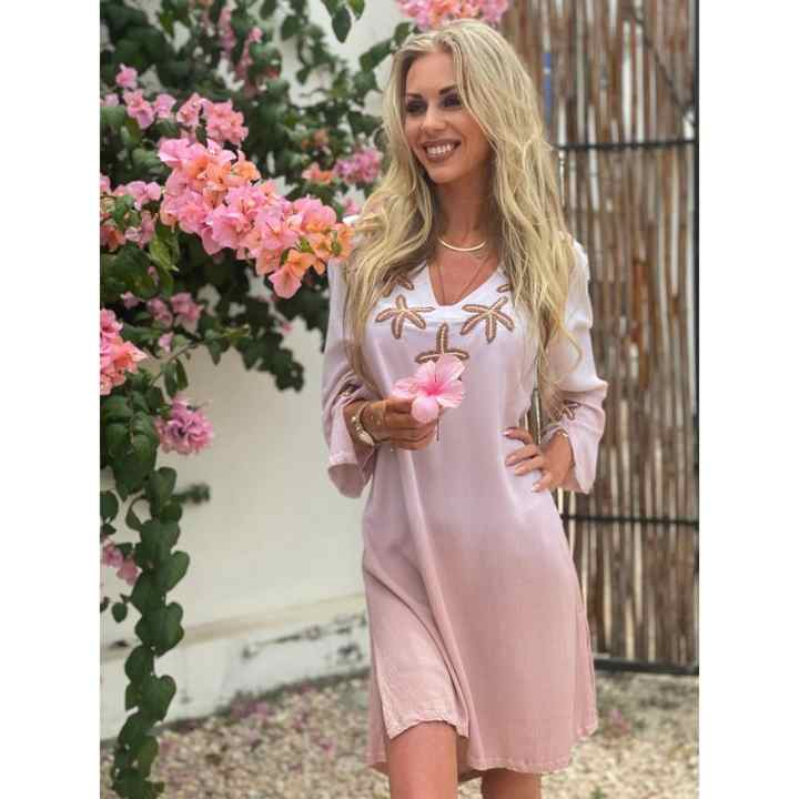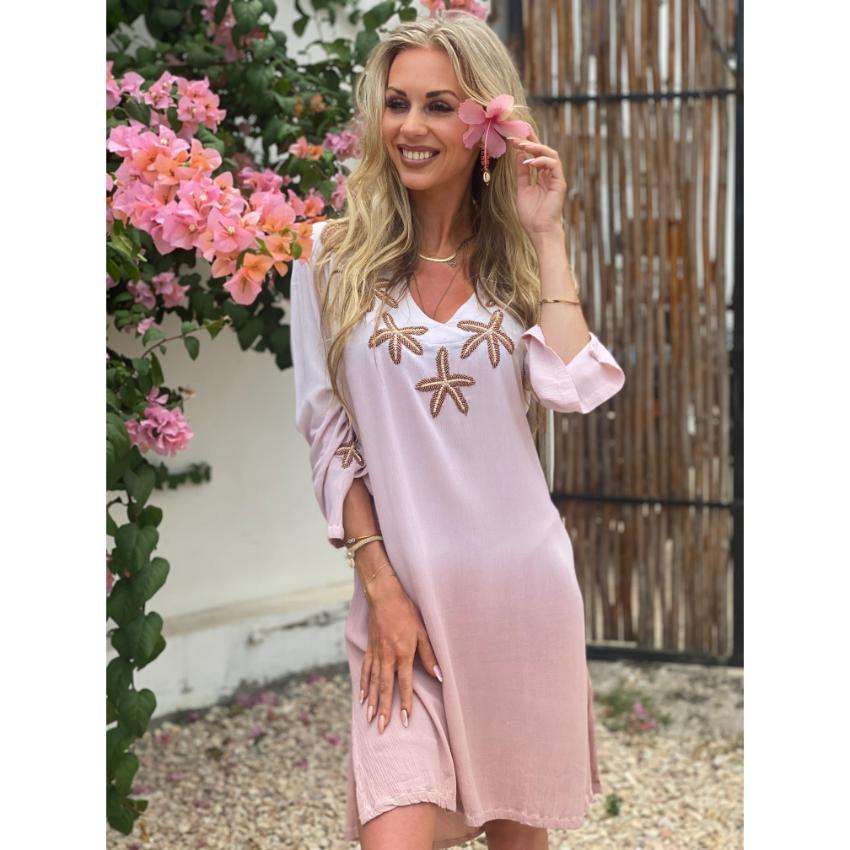 เดรสสั้นสีชมพูสไตล์โบฮีเมียน คอวี ปักลาย ยาวคลุมเข่า เป็นมิตรต่อสิ่งแวดล้อม ซักได้ แขนสั้น ใส่สบายๆ สำหรับฤดูร้อน