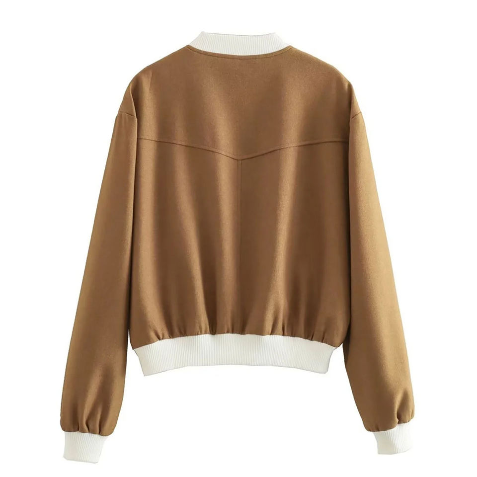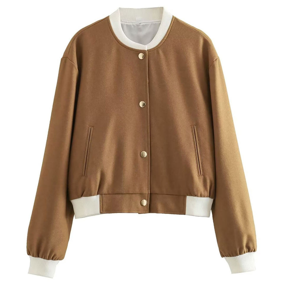 เสื้อแจ็คเก็ตบอมเบอร์ผู้หญิง แจ็คเก็ตวาร์ซิตี้สีพื้นแบบลำลองติดกระดุม มีกระเป๋าขนาดใหญ่ แจ็คเก็ตเลตเตอร์แมนแบบครอป