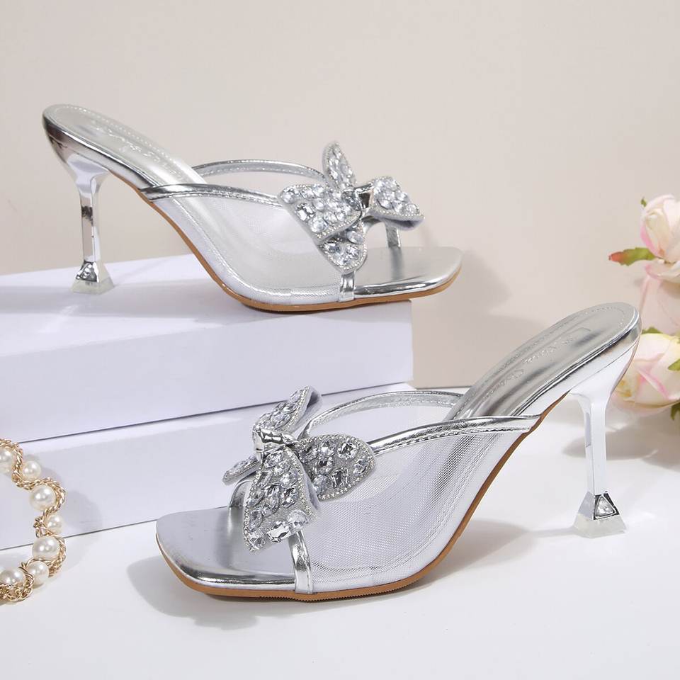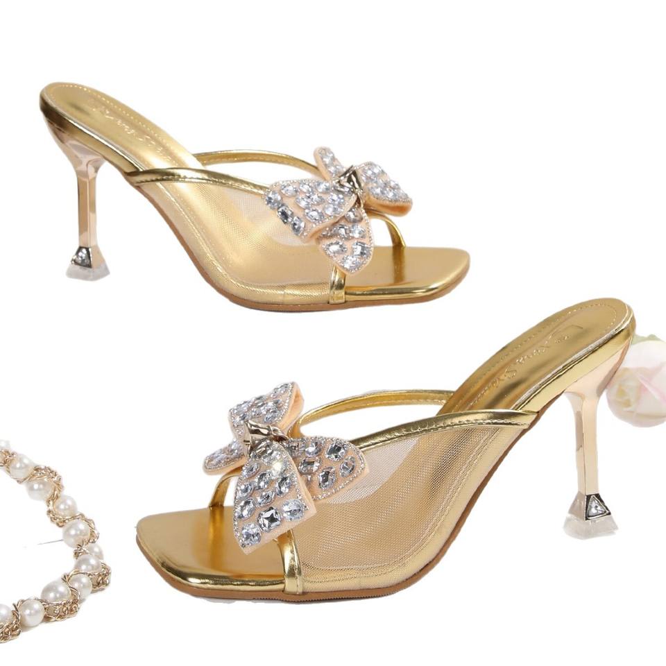 รองเท้าส้นสูงหัวเหลี่ยมประดับโบว์และเพชรพลอยสำหรับผู้หญิง รุ่นใหม่ล่าสุดสำหรับฤดูร้อน ไซส์ใหญ่ แฟชั่นตาข่ายระบายอากาศได้ดี