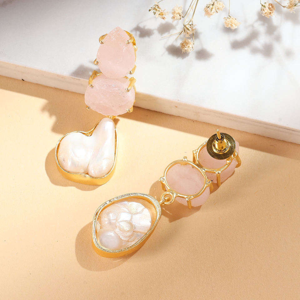 ต่างหูมุกทองเหลืองสำหรับผู้หญิง ประดับโรสควอตซ์และมุกบาโรกทรงหยดน้ำ สไตล์คลาสสิก เหมาะสำหรับงานปาร์ตี้