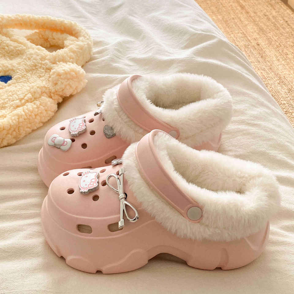 รองเท้าแตะแบบสวมครึ่งเท้าสำหรับผู้หญิง รุ่น Evergreen กันน้ำ ระบายอากาศได้ดี พื้นกันลื่น หนา บุขนด้านใน พร้อมที่คาดผม สวมใส่สบาย