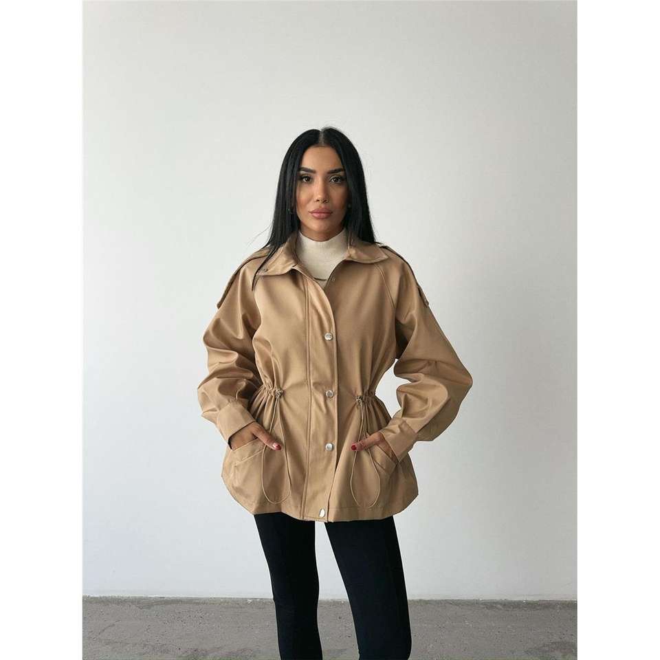 เสื้อแจ็คเก็ตสีน้ำตาลสำหรับผู้หญิงพร้อมเชือกรูดเอวและคอเสื้อแบบคอเต่า ผ้าเนื้อนุ่ม