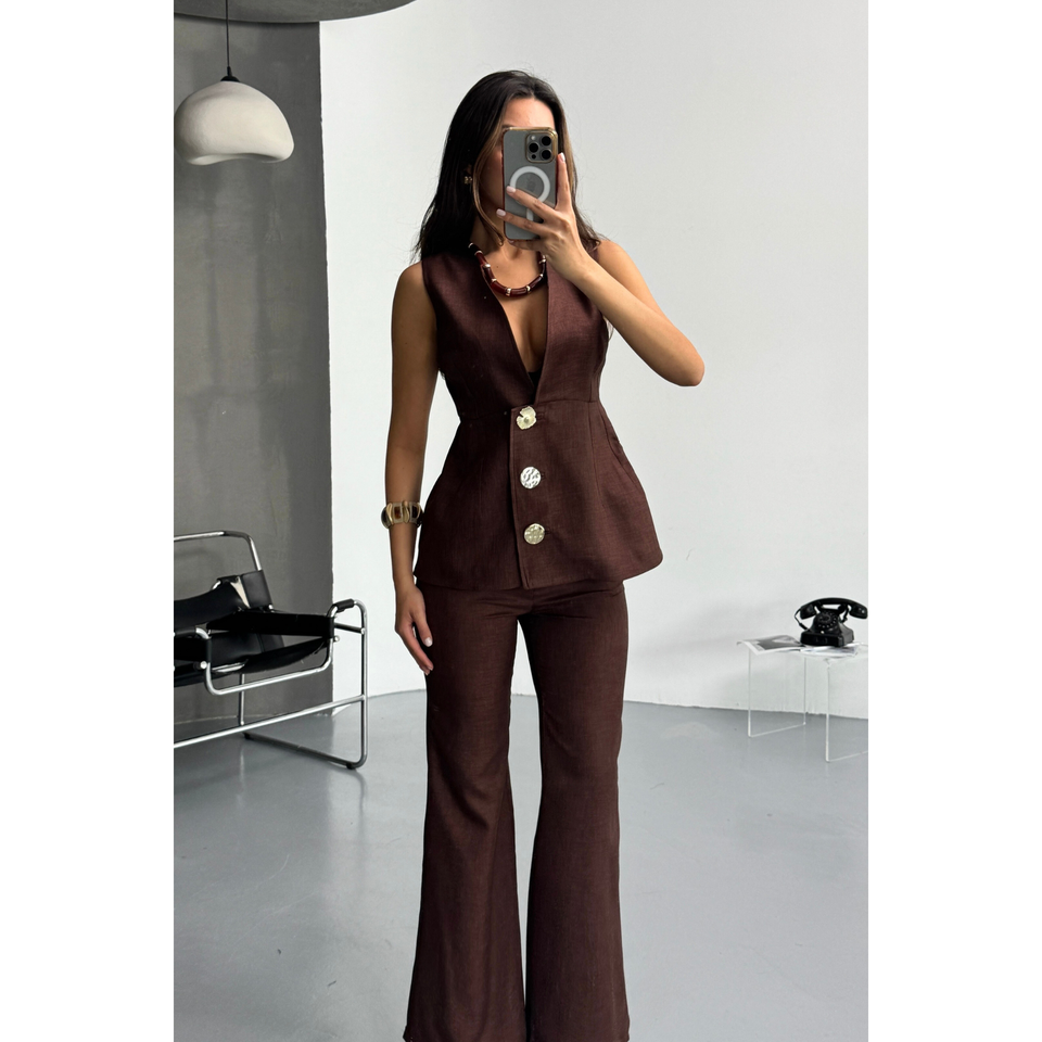 ชุดเสื้อกั๊กและกางเกงผ้าลินินสีน้ำตาลติดกระดุมสีทองสำหรับผู้หญิง ชุดทำงานลายเรียบสำหรับฤดูใบไม้ร่วงและฤดูหนาว ขั้นต่ำในการสั่งซื้อ 2 ชิ้น