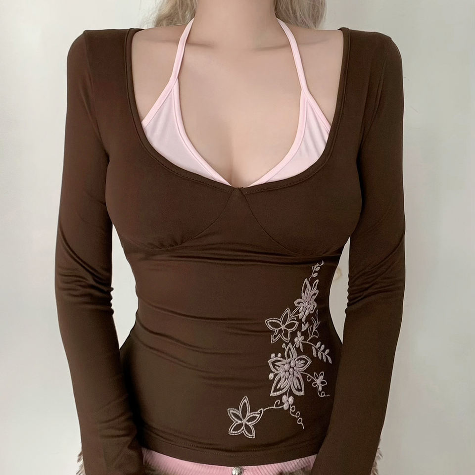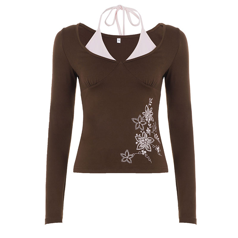 เสื้อยืดแขนยาวสีน้ำตาลสำหรับผู้หญิง ลายปักดอกไม้ คอวี ทรงเข้ารูป ยืดได้ มีเชือกผูกด้านหลัง สไตล์ลำลองแฟชั่น