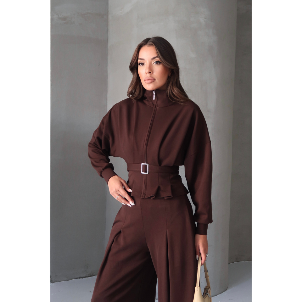 ชุดเซ็ตสีน้ำตาลสำหรับผู้หญิง กางเกงพลีททรงหลวมพร้อมเสื้อเบลาส์มีซิปและเข็มขัด