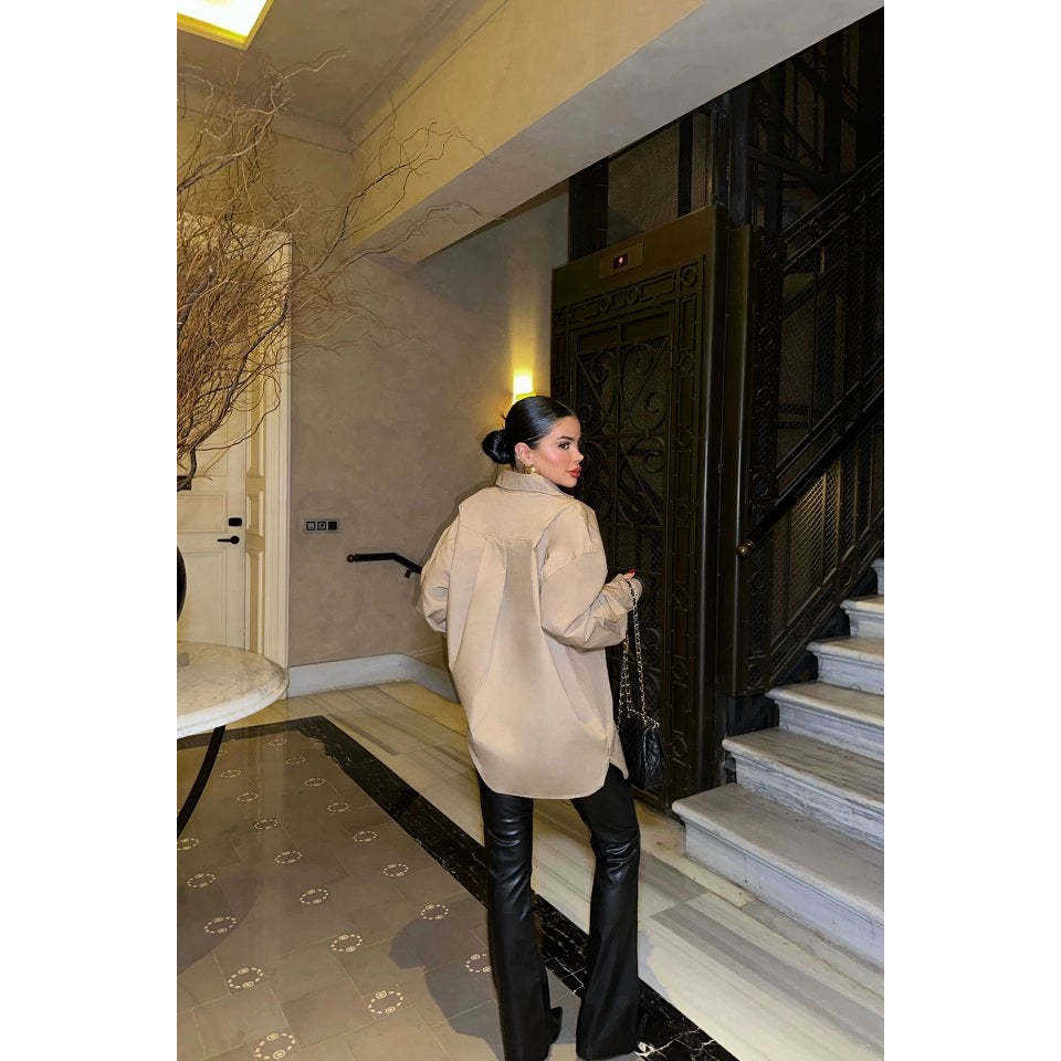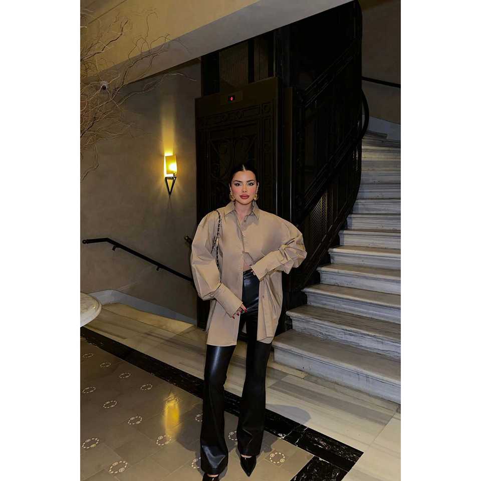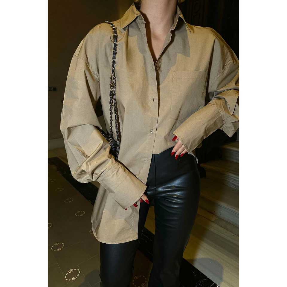 เสื้อเชิ้ตผ้าป๊อปลินสีน้ำตาลสำหรับผู้หญิงพร้อมดีเทลกระเป๋าสุดพิเศษ