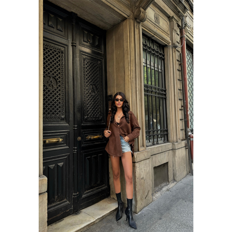 เสื้อหนังนิ่มสีน้ำตาลของผู้หญิงเสื้อหนังกลับหรูหราและมีสไตล์