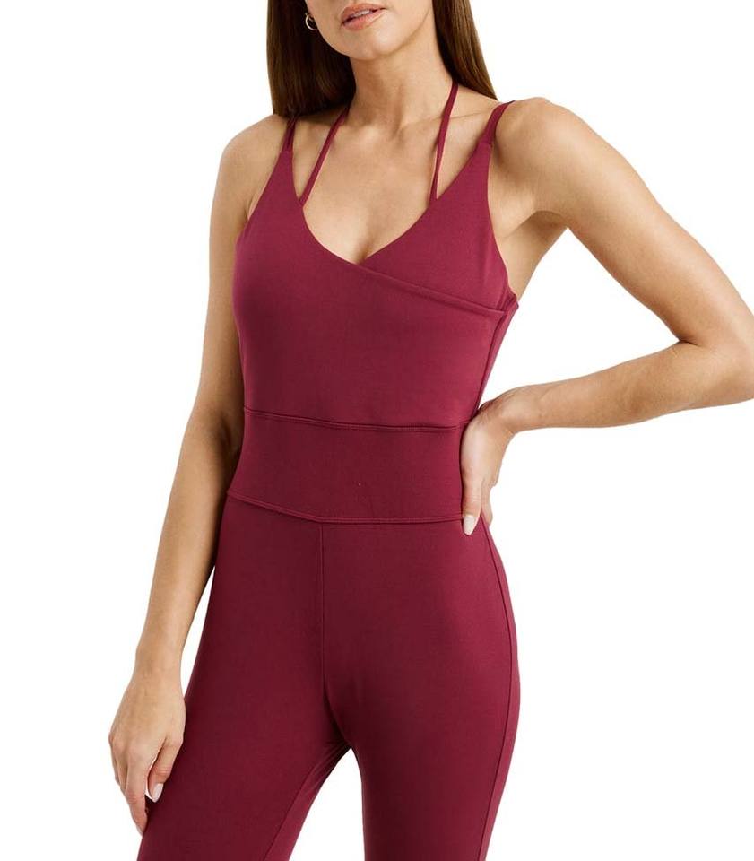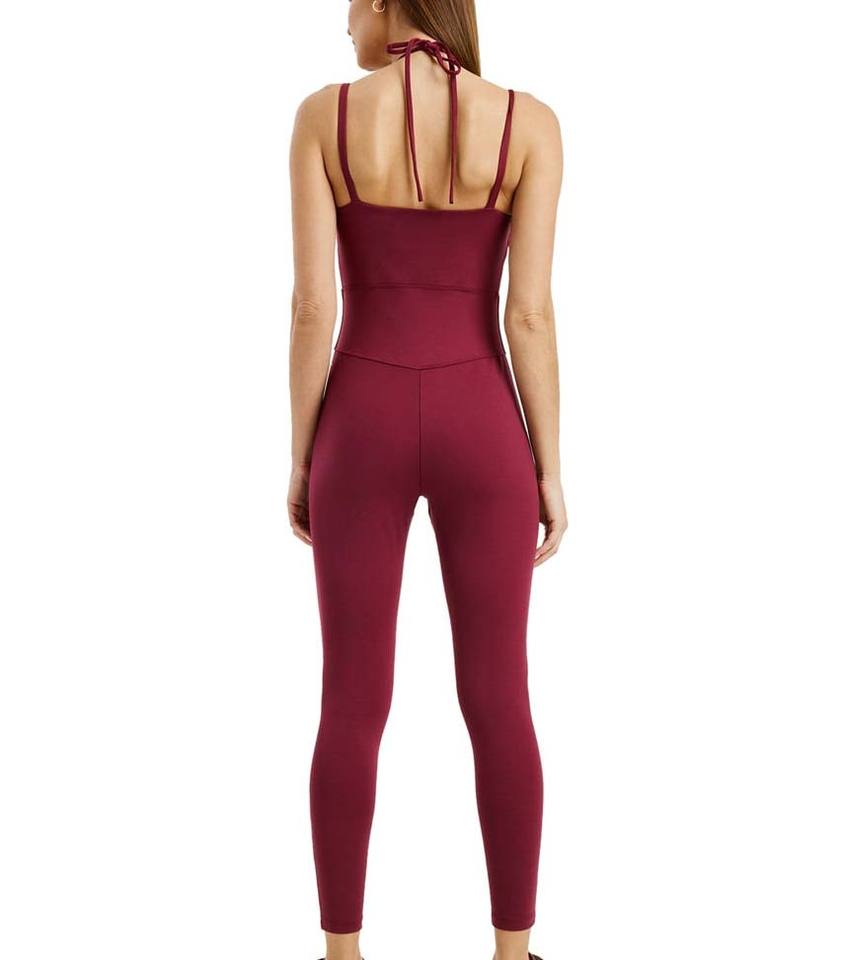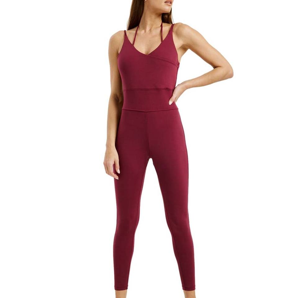 ชุดเสื้อครอปและเลกกิ้งสีเบอร์กันดีสำหรับผู้หญิง ชุดบอดี้สูทเอวสูงคอวีแขนกุด ชุดจั๊มสูทออกกำลังกาย ชุดลำลองสำหรับออกกำลังกาย
