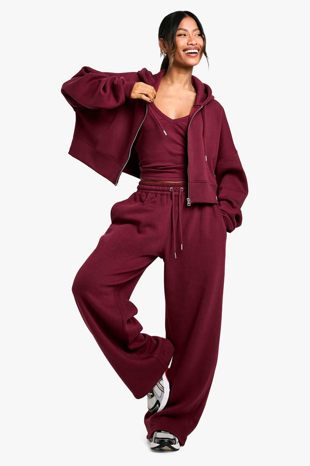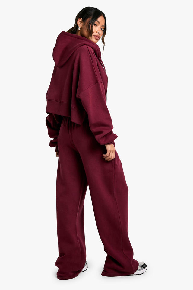 ชุดเซ็ตเสื้อฮู้ดครอปสีแดงเบอร์กันดีและกางเกงขายาวทรงกว้างสำหรับผู้หญิง ชุดลำลองสไตล์สบายๆ ชุดลำลองสองชิ้น