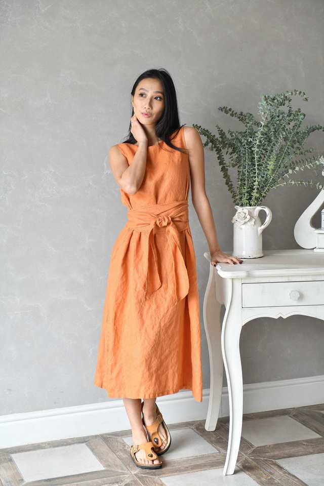 ชุดเดรสผ้าลินินสีส้มไหม้ของผู้หญิงชุดเดรสชายหาดแขนกุดผ้าลินินผ้าถักเป็นมิตรกับสิ่งแวดล้อมสไตล์โรแมนติกลำลอง