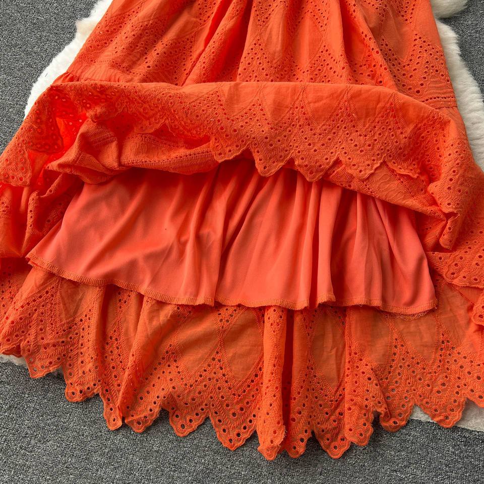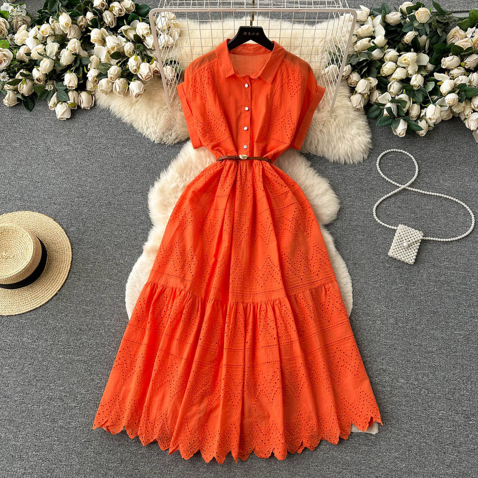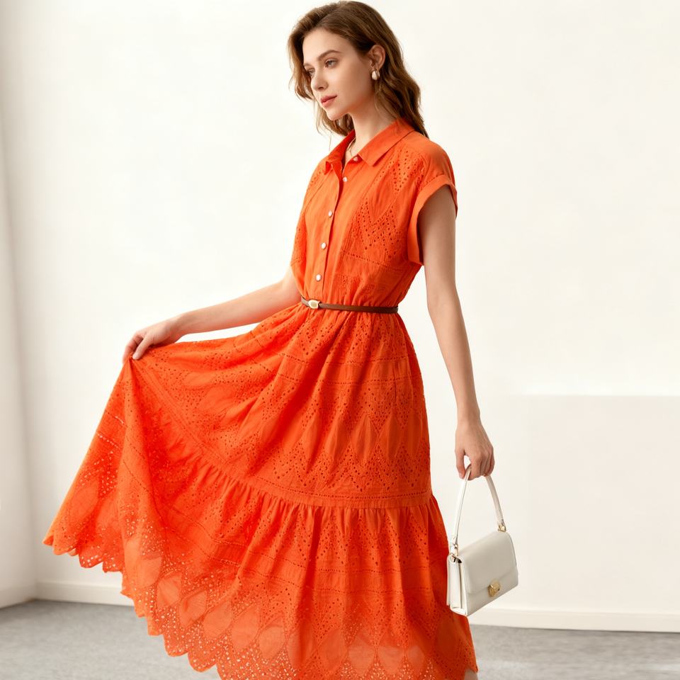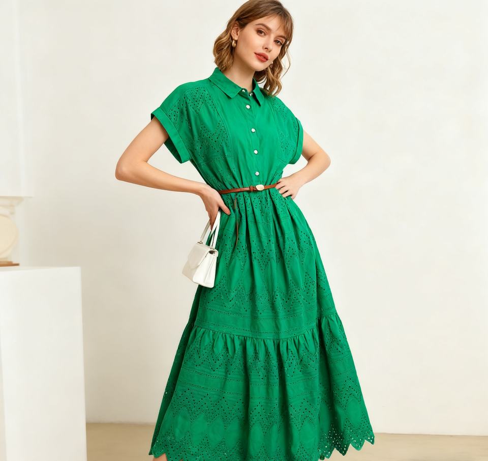 เดรสแฟชั่นผู้หญิงทรงหลวมติดกระดุมผ่าหน้าผูกเอวแต่งระบายคอเสื้อแบบแพทช์เวิร์ค
