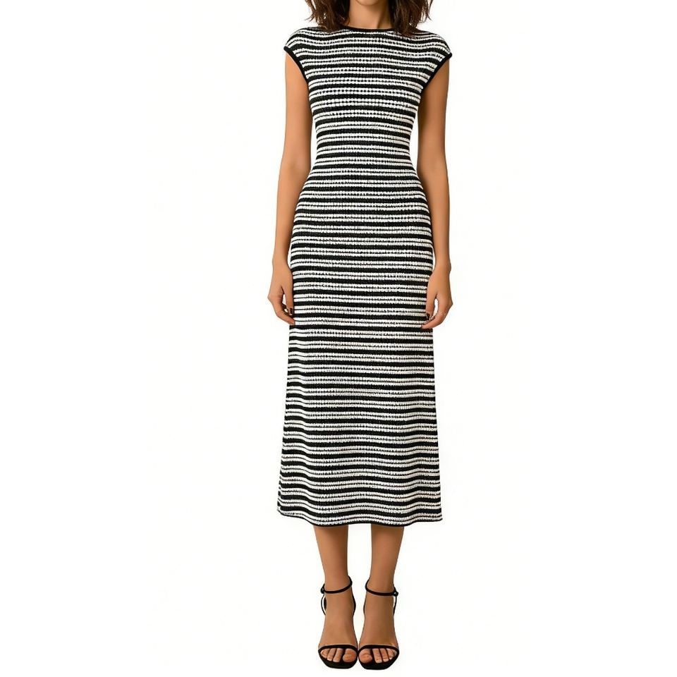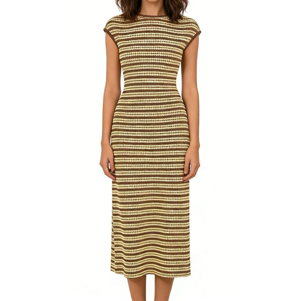 เดรสไหมพรมแขนสั้นลายทางสำหรับผู้หญิง ทรงเข้ารูป มีเท็กซ์เจอร์ พร้อมลายเรขาคณิตสไตล์เรโทร แฟชั่น